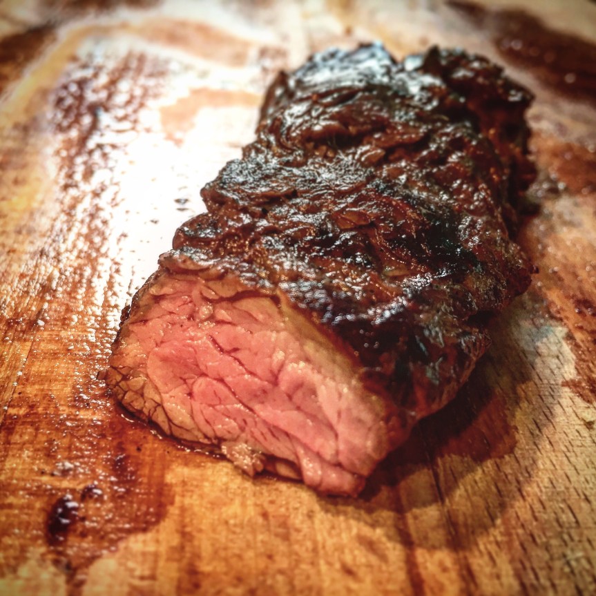 Ein weiteres, bei uns eher unbekanntes Stück vom Rind ist der Nierenzapfen, auch Onglet oder Hanging Tender genannt. Charakteristisch ist die Sehne, die mitten durch das an ein X erinnernde Fleisch verläuft. Das Onglet ist der Stützmuskel des Zwerchfells und existiert, im Gegensatz zum Filet, nur einmal pro Tier. Hierzulande wird es noch oft zu Hackfleisch verarbeitet, aber man findet es auch zunehmend in der Auslage. Es hat eine etwas festere Struktur als das Flap Steak und erinnert mich eher an das Flanksteak, ist aber zarter als dieses. Geschmacklich ist es definitiv zu empfehlen … eine schöne Abwechslung zu den Standard-Cuts wie Filet und Co.!