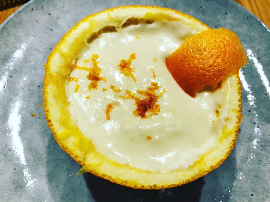 Die Früchte waschen, halbieren und auspressen. Wer möchte kann die Hälften als Schüsseln benutzen und diese mit einem Löffel ausschaben. Es empfiehlt sich am „Boden“ mit einem geraden Schnitt für gute Standfestigkeit zu sorgen 😉 Etwas Schalenabrieb und nach Wunsch auch Zesten zur Dekoration aufbewahren.