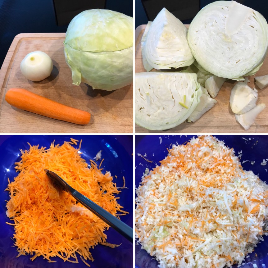 Zunächst Zwiebeln und Möhren schälen sowie den Kohl vierteln. Von den Kohlvierteln die Strünke entfernen wie oben rechts zu sehen. Jetzt das Gemüse mit Messer oder Küchenmaschine nach Wunsch in Stifte schneiden bzw. hobeln.