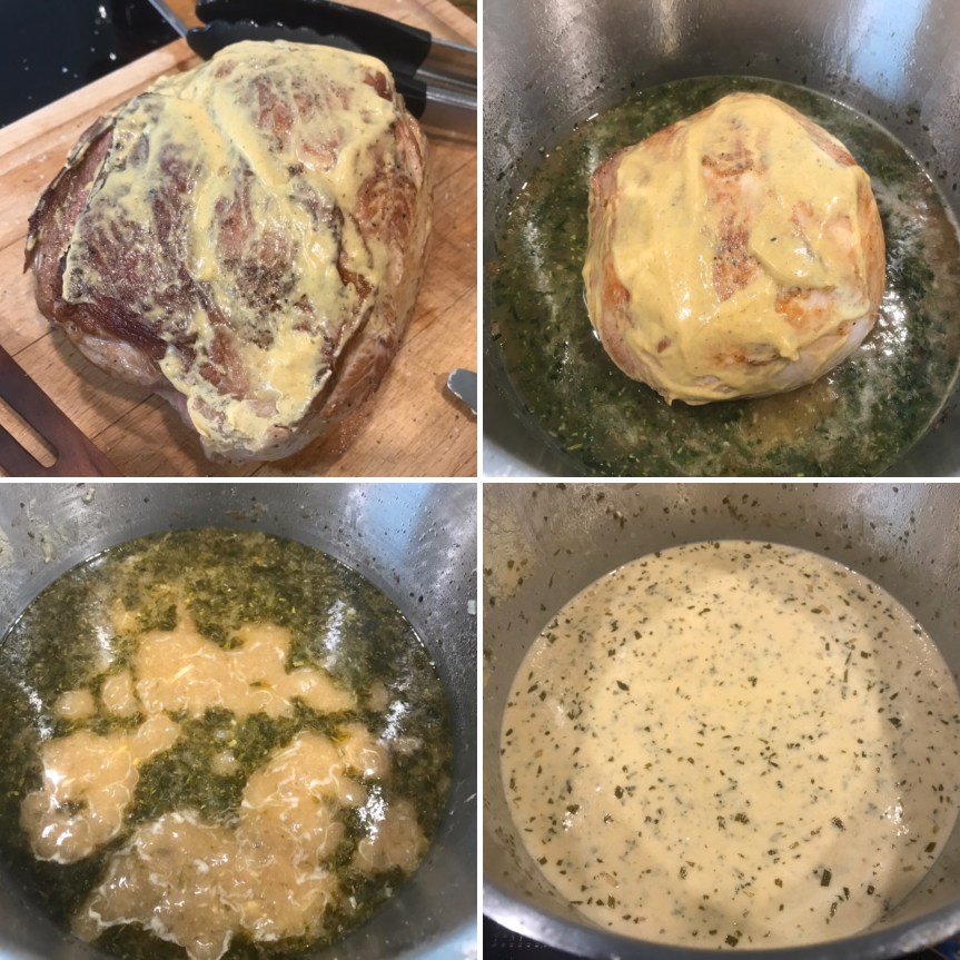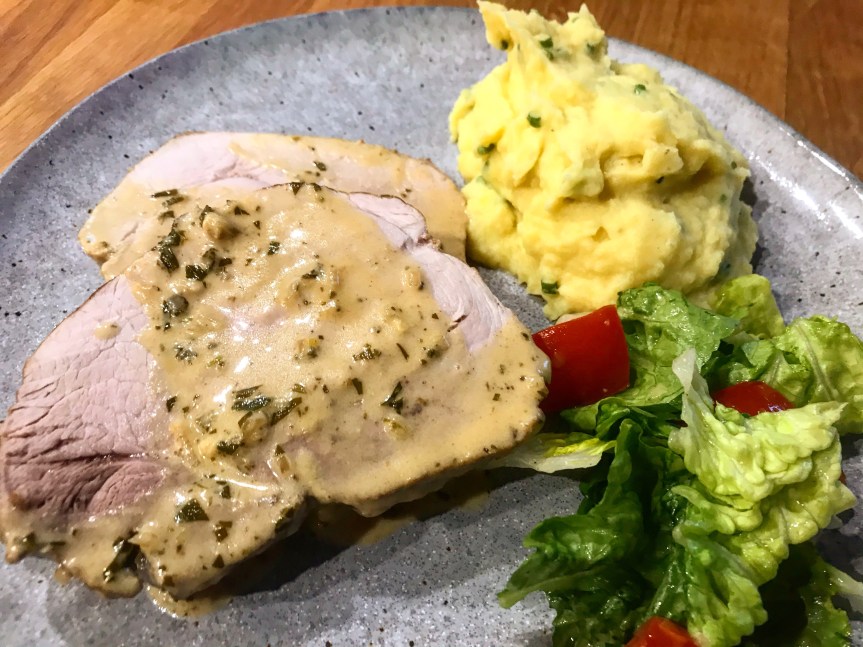 … oder auf französisch à la moutarde. Eigentlich klassischerweise mit Hase zubereitet, schmeckt es mit einem leckeren Schweinebraten, z.b. aus der Nuss, mindestens genau so gut! Die Sosse besteht aus Weisswein, Estragon, Rosmarin und Salbei und wird mit Sahne und Senf abgeschmeckt. Durch den während der Garzeit austretenden Fleischsaft entsteht eine wirklich wunderbare Soße, die man unbedingt einmal ausprobieren sollte. Zusammen mit Senf-Schnittlauch-Püree und Salat eine grandiose Mahlzeit!