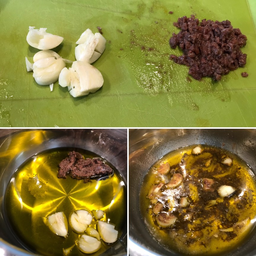 Die Knoblauchzehen zerdrücken und die Schale entfernen, die Sardellenfilets fein hacken. Beides dann zusammen mit einem halben Teelöffel Meersalz in den 100 ml Olivenöl bei niedriger Hitze ca. 10 Minuten köcheln lassen. Der Knoblauch soll nicht braun sondern nur weich werden.