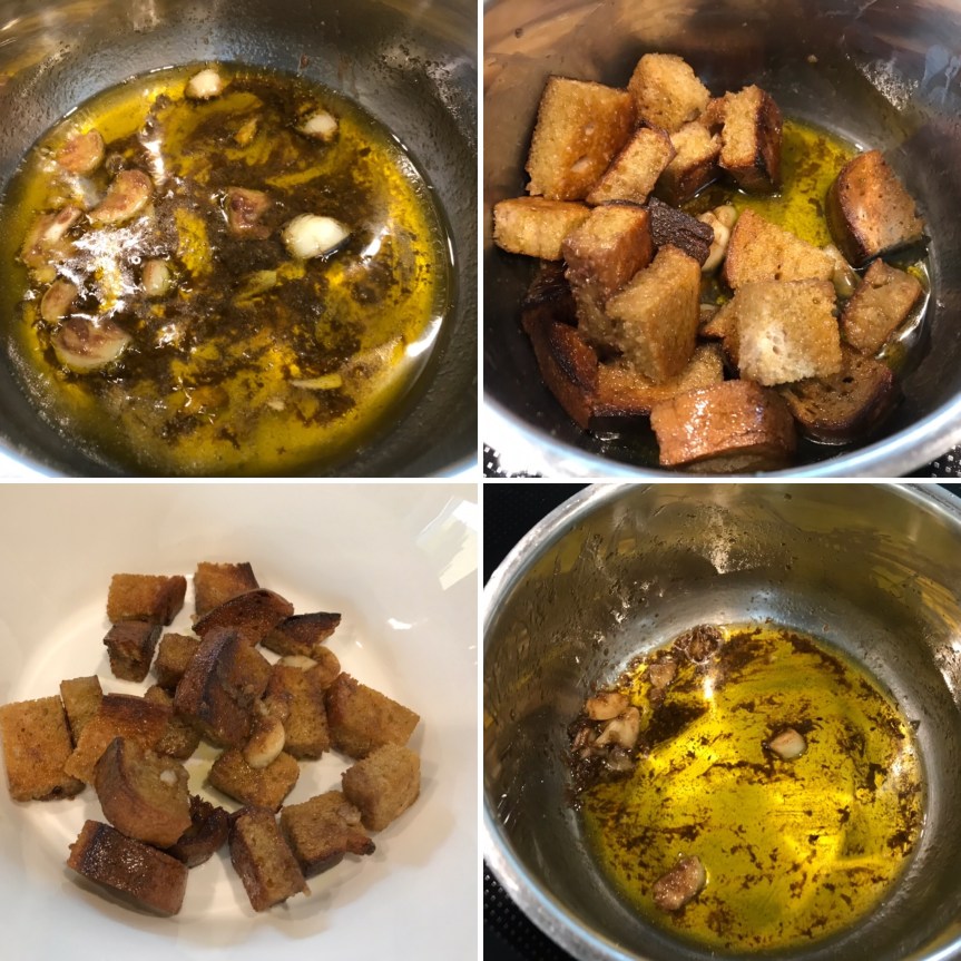 Die gerösteten Brotwürfel in das Öl geben und gründlich umrühren, so das alle Stücke mit Öl benetzt sind. Die Würfel dann in eine Schale geben, das restliche Öl aufbewahren.