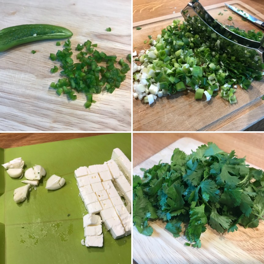 Chilischote, Koriander und Frühlingszwiebeln fein hacken, den Knoblauch schälen und grob zerdrücken und den Feta in kleine Würfel schneiden.