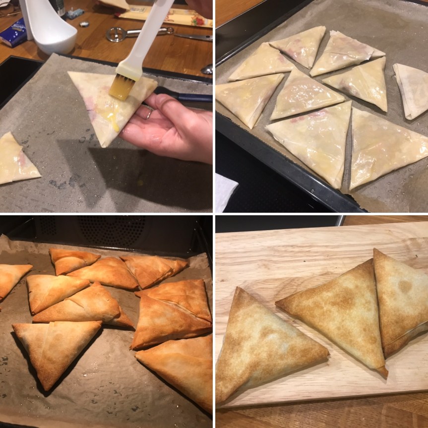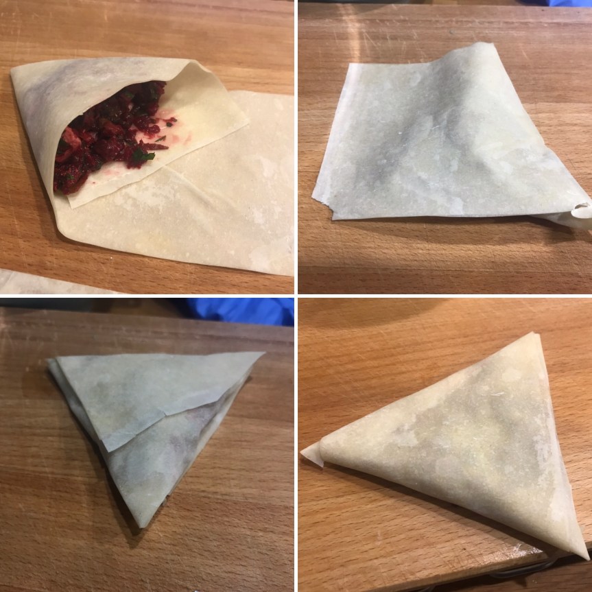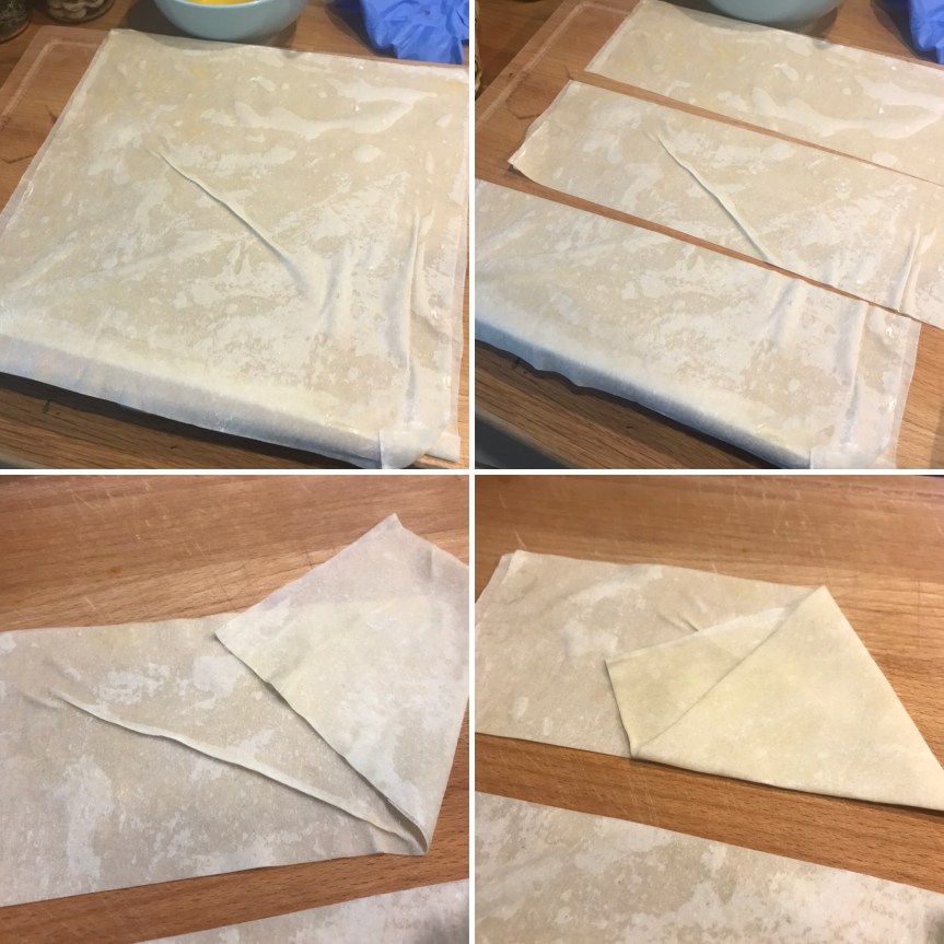 Ein Blatt des Filoteigs auslegen und dünn mit Butter bepinseln, dann ein zweites passgenau darüberlegen. Die Blätter in 3 gleich große Streifen schneiden. Nun jeden Streifen wie oben zu sehen zweimal so falten, dass eine dreieckige Tasche mit einem quadratischen „Rest“ entsteht.