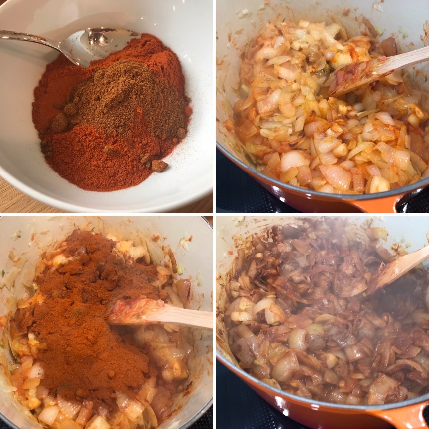 Jetzt das Fleisch hinzugeben und alles für 2-3 h in den Ofen geben, bis das Fleisch zart ist und die Zwiebeln zerfallen. Gelegentlich umrühren. Sollte es doch zu trocken werden, notfalls mit etwas Rinderfond angießen, aber Fleisch und Zwiebeln geben erstaunlich viel Flüssigkeit ab, das reicht normalerweise.