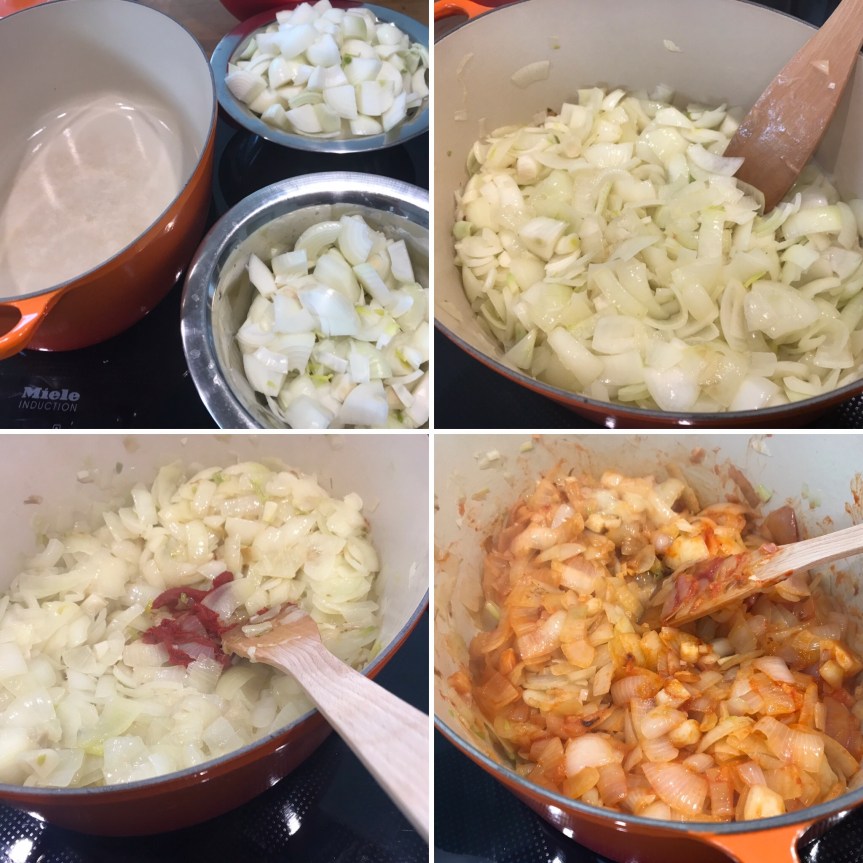 In einem großen Topf oder Bräter Zwiebeln und Knoblauch bei mittlerer Hitze glasig oder goldgelb andünsten. Das Tomatenmark hinzugeben und anschwitzen. Alles gründlich verrühren und vom Herd nehmen.