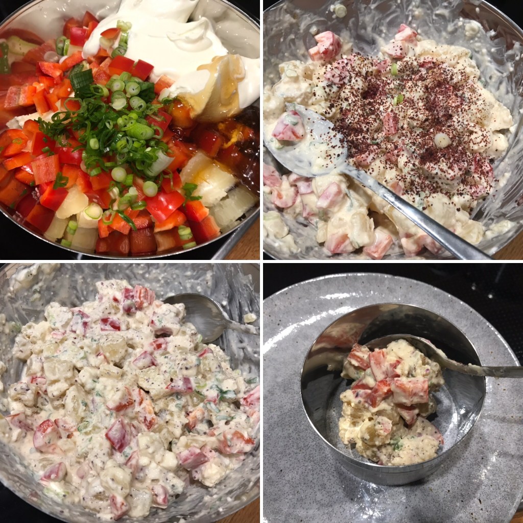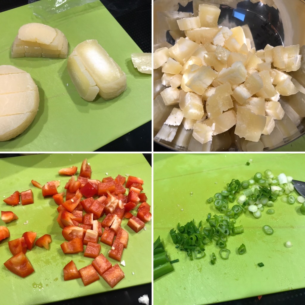 Der Handkäs wird in ca. 1 cm große Würfen geschnitten. Oben erkennt man gut den „unreifen“ Kern, dieser Käse hätte gut noch einige Tage reifen können. Die Paprika wird ebenfalls gewürfelt, die Frühlingszwiebeln in feine Ringe geschnitten.