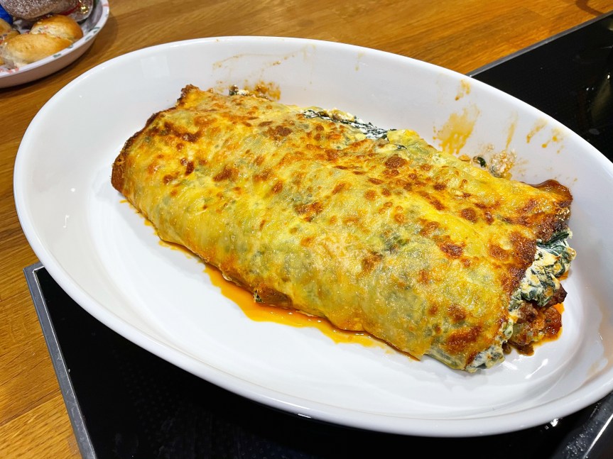 Die Rolle muss nun nochmals für ca. 15 Minuten bei 180° Umluft in den Ofen, bis die Füllung geschmolzen und die Hülle gebräunt ist. Das transferieren in eine Auflaufform ist übrigens sehr riskant, wie man auf obigem Foto erkennen kann, das tut dem Geschmack jedoch keinen Abruch 😉 Dazu passt ein grüner Salat oder z.B auch Reis als Beilage. Guten Appetit!