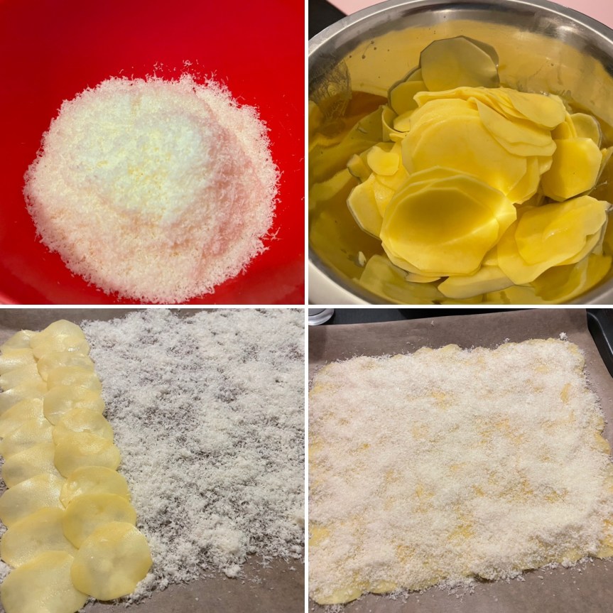 Die unangenehmste Arbeit zuerst: den Parmesan fein reiben und die geschälten Kartoffeln in dünne, wirklich dünne Scheiben hobeln. Dann auf Backpapier eine dünne Schicht Parmesan ausstreuen und die Kartoffelscheiben großzügig überlappend darüber legen. Dann wieder Parmesan darüber streuen und alles bei 160 ° Umluft für 20-30 Minuten backen, bis der Parmesan geschmolzen ist. Achtung, nicht braun werden lassen, denn dann lässt er sich später nicht mehr gut rollen und platzt leichter auf.