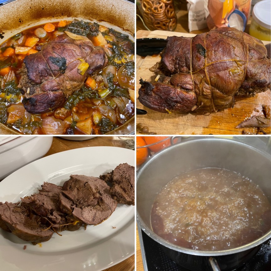 Die Rehkeule mit der Füllung und dazu aus gleichen Zutaten+Portwein+ Wildfond und Wurzelgemüsse eine Sauce= Suberlecker