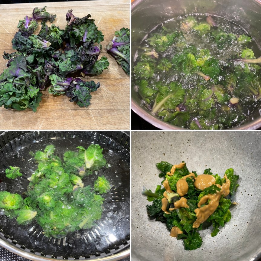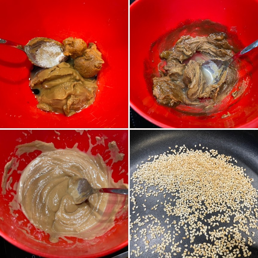 Als erstes bringen wir Wasser zum kochen, um die Flower Sprouts zu blanchieren, ausserdem benötigen wir es zur Herstellung unserer asiatischen Sesamsoße. Dazu verühren wir Sesampaste, Miso, Sojasoße miteinander und verdünnen die Paste mit heißem Wasser (ca. 6-8 EL) bis zur gewünschten Konsistenz. Die Sesamsamen rösten wir in einer beschichten Pfanne goldgelb an. Wer möchte kann einen Teil auch direkt in die Soße rühren. Nun nur noch mit Zucker (ca. 1-2 TL) abschmecken.