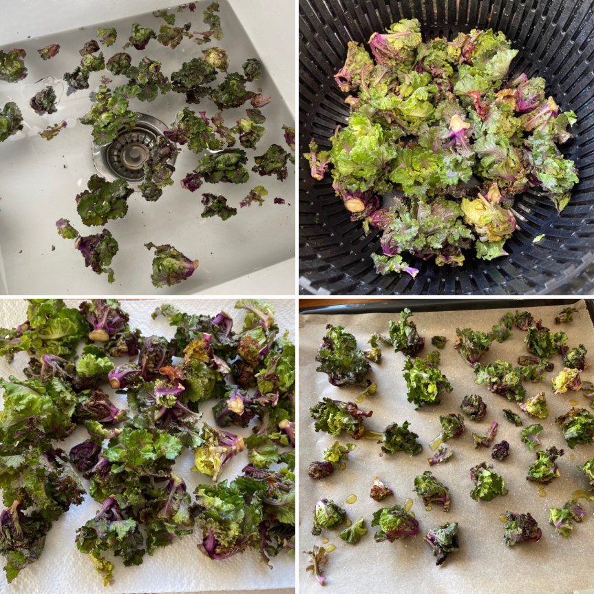 Als erstes waschen wir die Kalettes und trocknen sie dann gründlich, am besten in einer Salatschleuder. Dann kommen sie auf ein Backblech mit Backpapier und werden mit etwas Olivenöl beträufelt sowie leicht gesalzen. Das Blech kommt nun für ca. 30-40 Minuten bei 140° Umluft in den Ofen. Dabei öffnen wir ein paar Mal den Ofen und lassen die Feuchtigkeit entweichen.