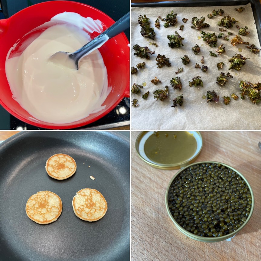 Nun kann unser Fingerfood endlich angerichtet werden: auf ein Blini kommt ein Klecks Creme fraiche, darauf ein Kalettes-Chip, wieder etwas Creme fraiche und dann als Topping der Kaviar. Ein Blatt Kresse o.ä. als Deko … und fertig zum genießen!