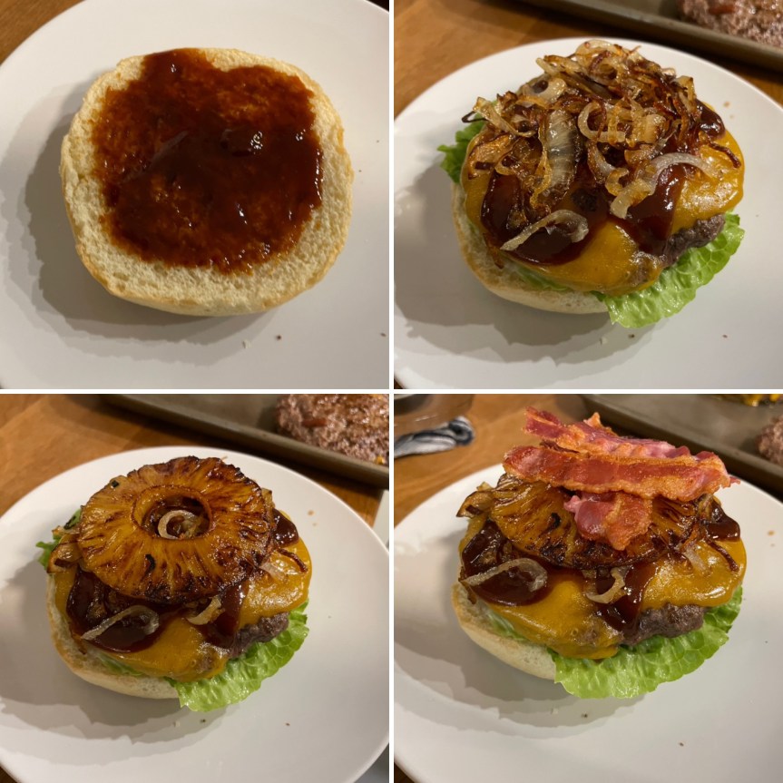 Nun darf endlich zusammengebaut werden: Die Brötchenhälfte leicht anrösten, die Unterseite mit etwas Soße bestreichen, dann mit einem Salatblatt belegen. Darauf ein Burgerpatty mit Käse setzen, wieder etwas Soße darauf geben, Röstzwiebeln, Ananas und Bacon (und wer mag Tomatenscheiben). Und fertig!