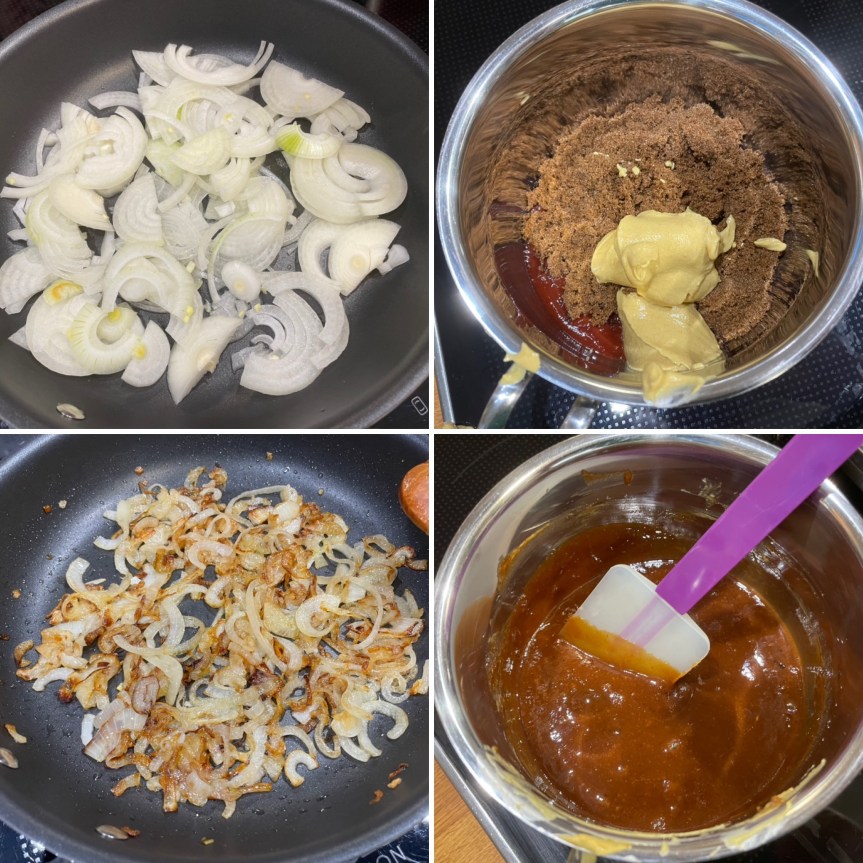 Als erstes schälen wir die Zwiebeln und schneiden die halbierten Zwiebeln in dünne Scheiben. Mit etwas Öl und Zucker dürfen diese jetzt bei mittlerer Hitze schön bräunen. Währenddessen in einem Topf aus den braunen Zucker, Senf und Ketchup Burgersoße verrühren, mit Limettensaft abschmecken und warmhalten.