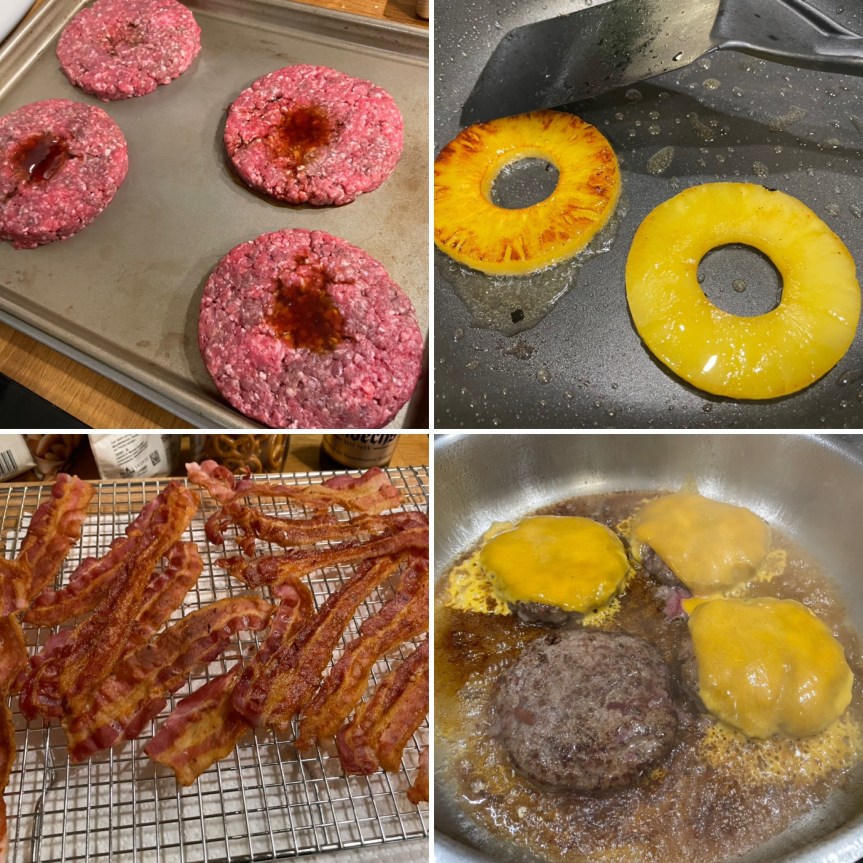 Das Hackfleisch mit Salz und Pfeffer würzen und 150 g schwere Patties formen. Diese mit je einem Esslöffel Teriyakisoße beträufeln und ziehen lassen. In der Zwischenzeit lassen wir den Bacon bei mittlerer Hitze in einer Pfanne ohne Fett knusprig ausbraten und auf einem Gitter abkühlen. Die Ananasringe mit wenig Öl ebenfalls appetitlich bräunen. Jetzt die Burger langsam bis zum gewünschten Gargrad braten. Am Ende mit dem Käse belegen und mit Deckel oder Alufolie abdecken, bis dieser geschmolzen ist.