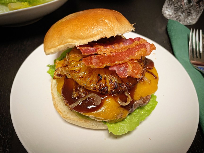 … bzw. auch „Burger Hawaii“ oder ganz böse „Quetschbrötchen Hawai“, aber das würde dem Kultstatus, den dieser Burger dank einem der besten Filme aller Zeiten genießt, natürlich nicht gerecht! Bekannt ist er nämlich aus Pulp Fiction, wo er eine kurze aber prägnante Rolle spielt. Es ist eine relativ süße Burgervariante, die man aber mit Bacon auf genau die richtige Spur bekommt: unglaubliche Leckerheit 😉 Nachgrillen empfohlen!