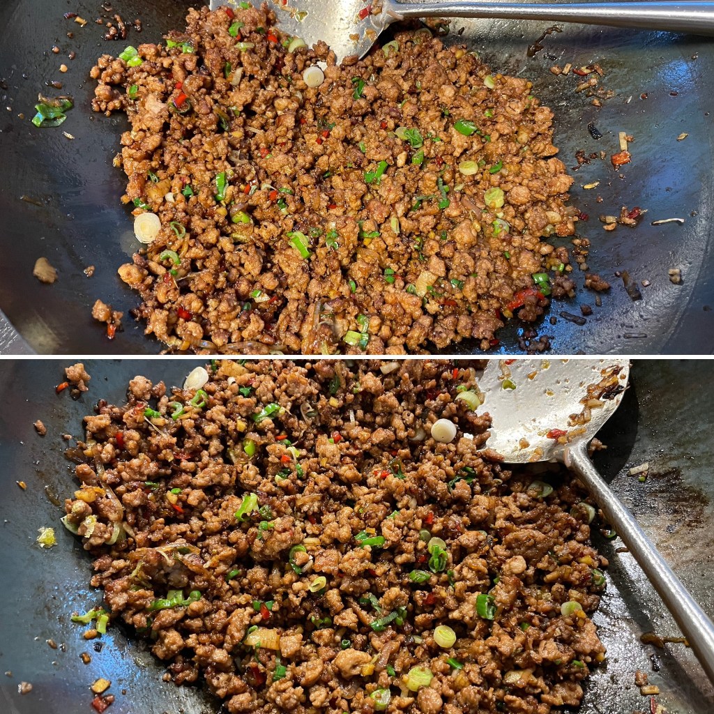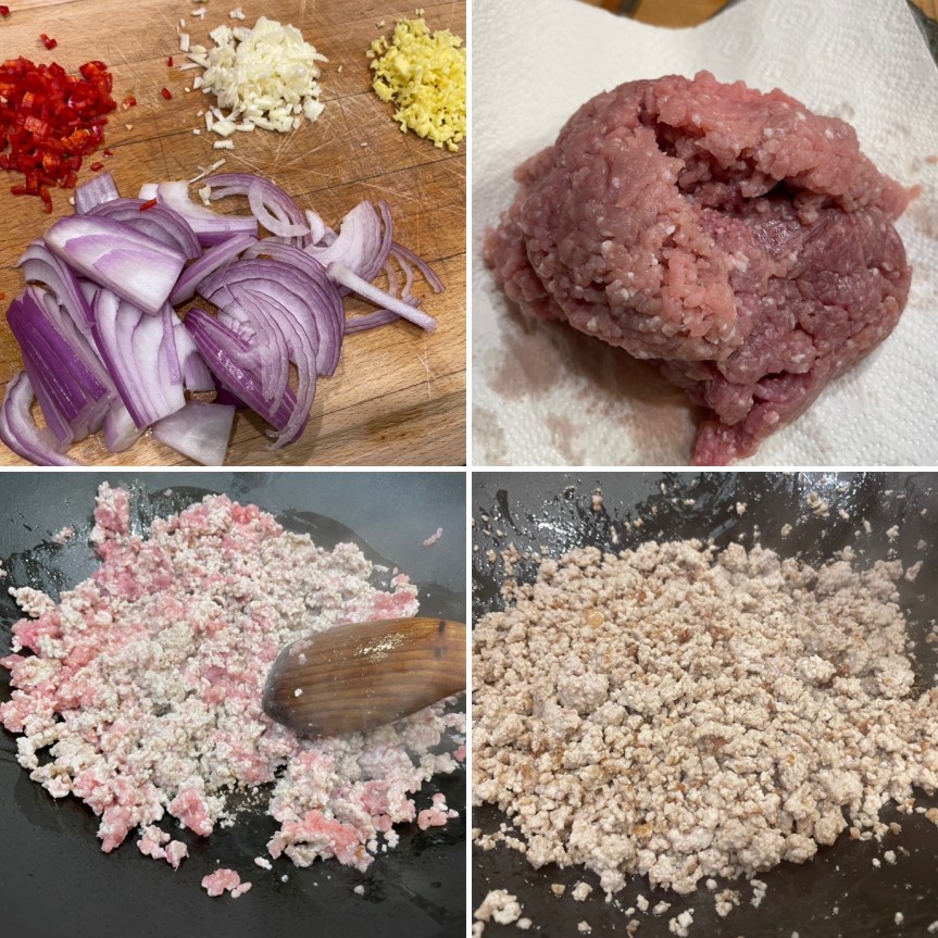 Chili, Ingwer und Knoblauch schälen und fein würfeln. Die Schalotte in feine Streifen schneiden. Nun das Hackfleisch in einer möglichst heißen Pfanne / Wok scharf anbraten. Nicht zuviel rühren, es soll möglichst nur bräunen, fertig gegart wird es später. Sobald wir die gewünschte Bräunung haben, das Fleisch aus dem Wok nehmen und beiseite stellen.