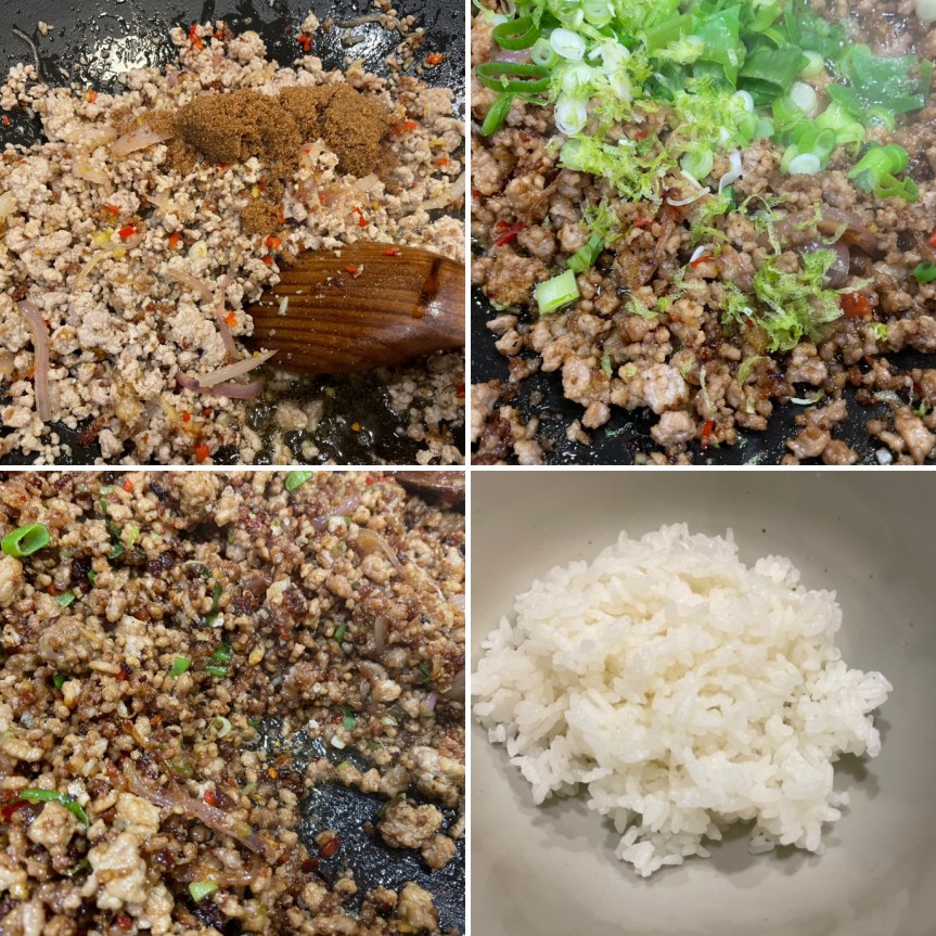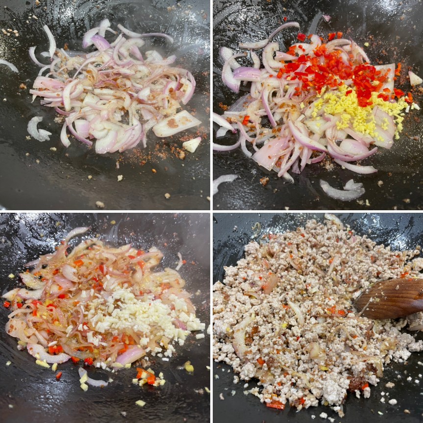 Jetzt die Schalotten ca 1 Minute anschwitzen, dann Chili, Ingwer und Knoblauch dazugeben und alles kurz braten, bevor das Hackfleisch wieder dazugegeben wird.