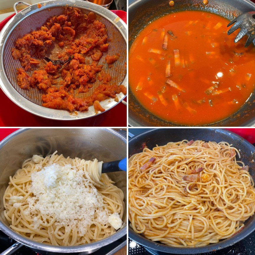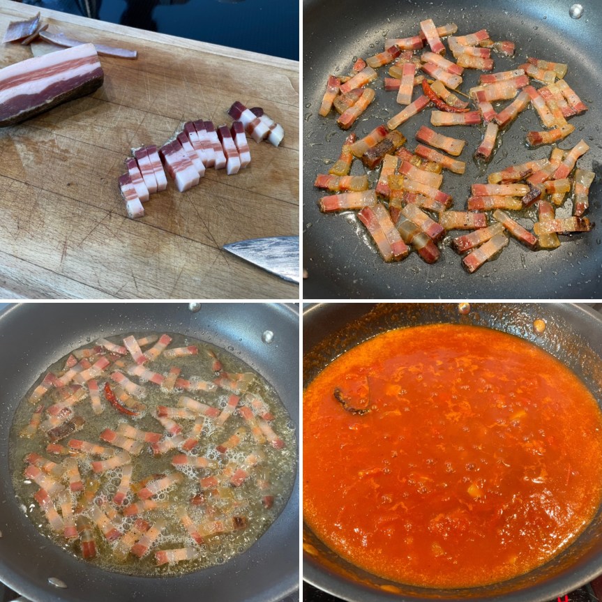 Zunächst schneiden wir den Guanciale in Stifte, welche mit etwas Olivenöl glasig angebraten werden. Die Chilischote soll kurz mitgebraten werden. Dann wird mit dem Weisswein (und optional etwas Fond) abgelöscht. Der Speck kommt nun hinaus, und dafür dürfen die Tomaten hinein in die Pfanne. Das ganze lassen wir nun für 10 Minuten köcheln.