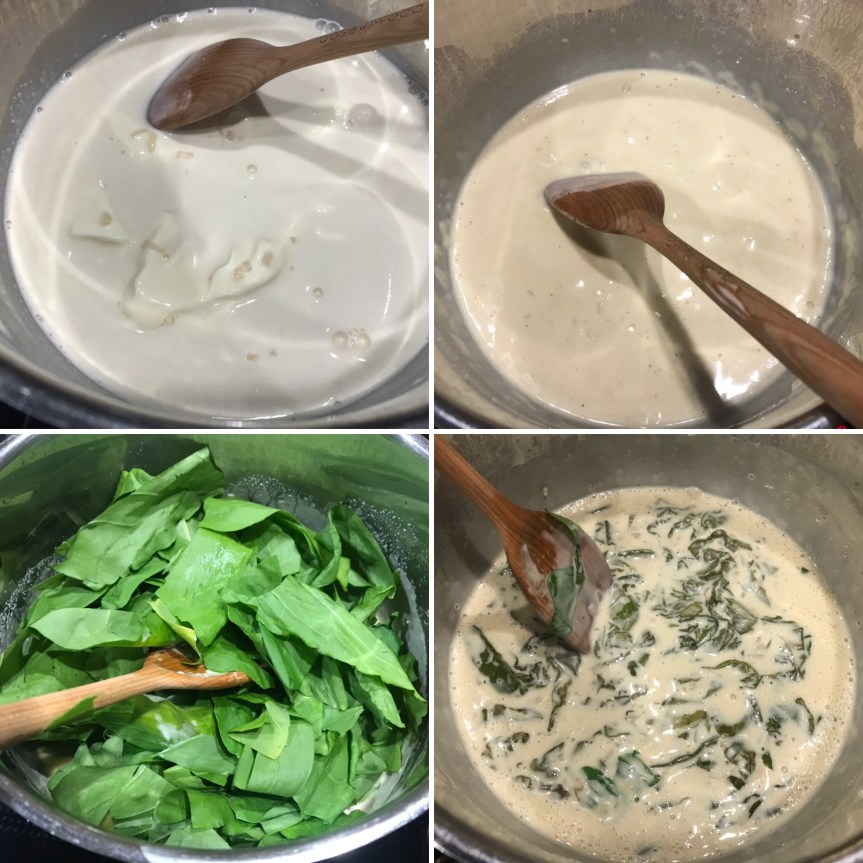 Nun Sahne und Creme double in den Topf geben und bei schwacher Hitze erneut um die Hälfte bis 1/3 einkochen lassen. Mit Zitronensaft, Salz und Pfeffer abschmecken und die nur sehr grob zerkleinerten Sauerampferblätter hinzufügen. Wenn diese zusammengefallen sind, die Soße warmstellen.