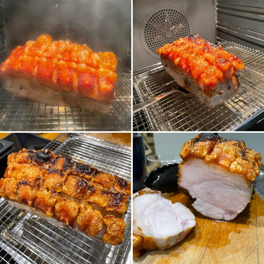 Währenddessen kümmern wir uns um das wichtigste, die Kruste! Dazu heizen wir den Backofen auf mindestens 220° Oberhitze bzw. Grillfunktion auf. Wenn der Braten im Ofen ist, sollte man ihn nicht mehr aus den Augen lassen. Sobald die Schwarte ordentlich aufgeoppt ist, darf das Fleisch wieder heraus und einige Minuten abkühlen, bevor wir es anschneiden und mit der abgeschmeckten Soße servieren. Dazu passen z.b. Klöße wunderbar oder Aligot – cremiges Kartoffel-Käse-Püree. Guten Appetit!