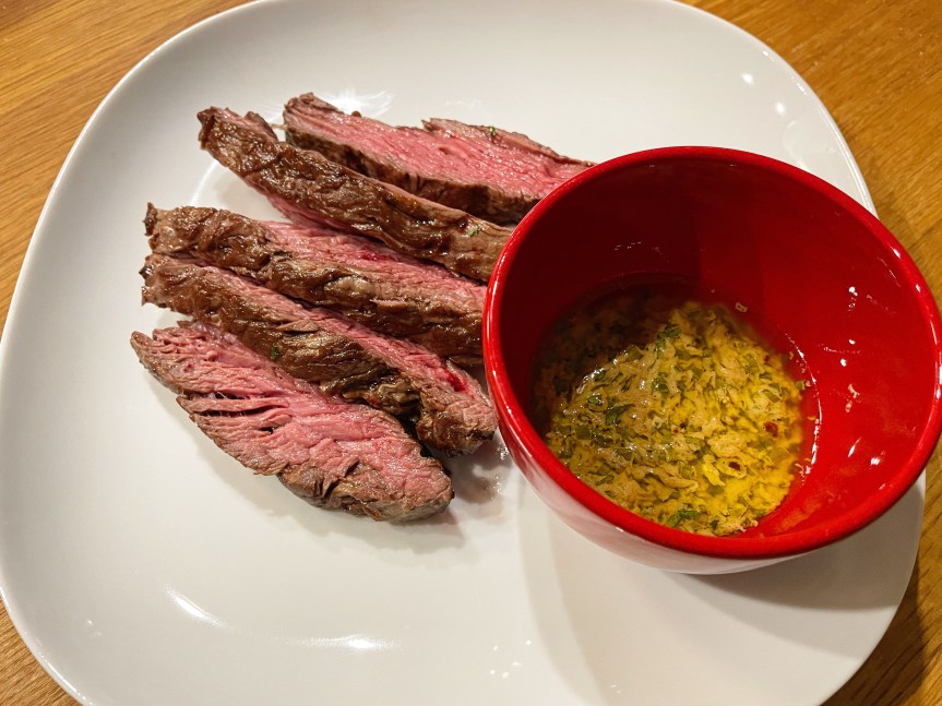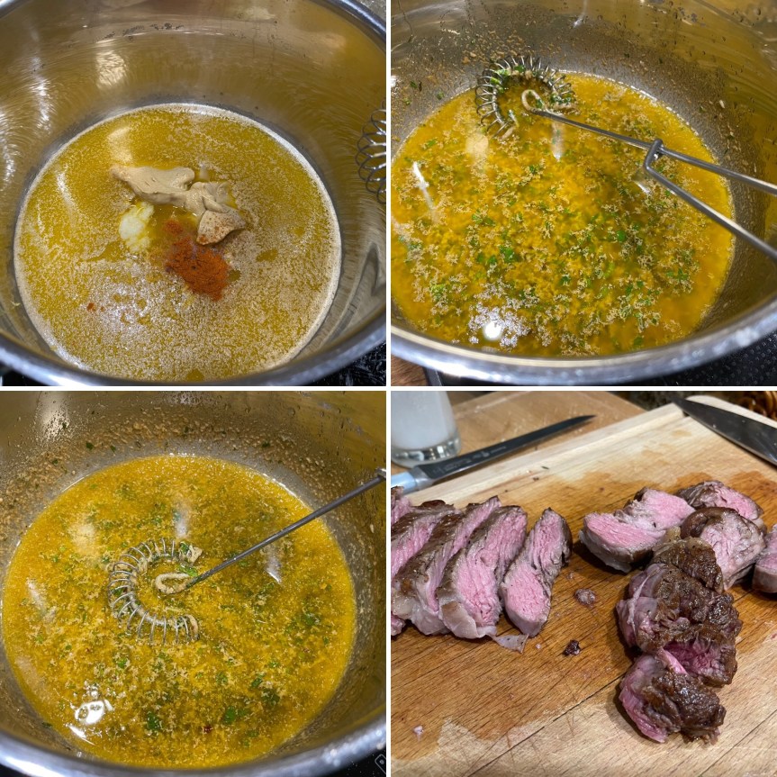 Die Butter lassen wir schmelzen und rühren dann etwa den Saft einer halben Zitrone sowie die Zitronenzeste, den Knoblauch, 2 EL Senf, 1 TL Paprikapulver sowie etwas Cayennepfeffer (und optional 1 TL Sahnemeerrettich) unter. Jetzt kommen Kräuter und 0,5 bis 1 TL Chiliflocken dazu. Mit Salz und Pfeffer abschmecken. Das Steak 10 Minuten ruhen lassen und aufschneiden.