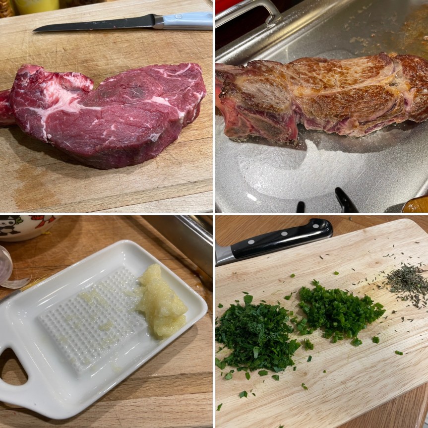 Das Steak wird pariert und angebraten, um anschließend indirekt im Grill oder Ofen garziehen zu können (ich empfehle 54° Kerntemperatur). Den Knoblauch reiben oder fein hacken, 2 EL Petersilie und Schnittlauch sowie ca. 1 TL Thymian fein hacken.