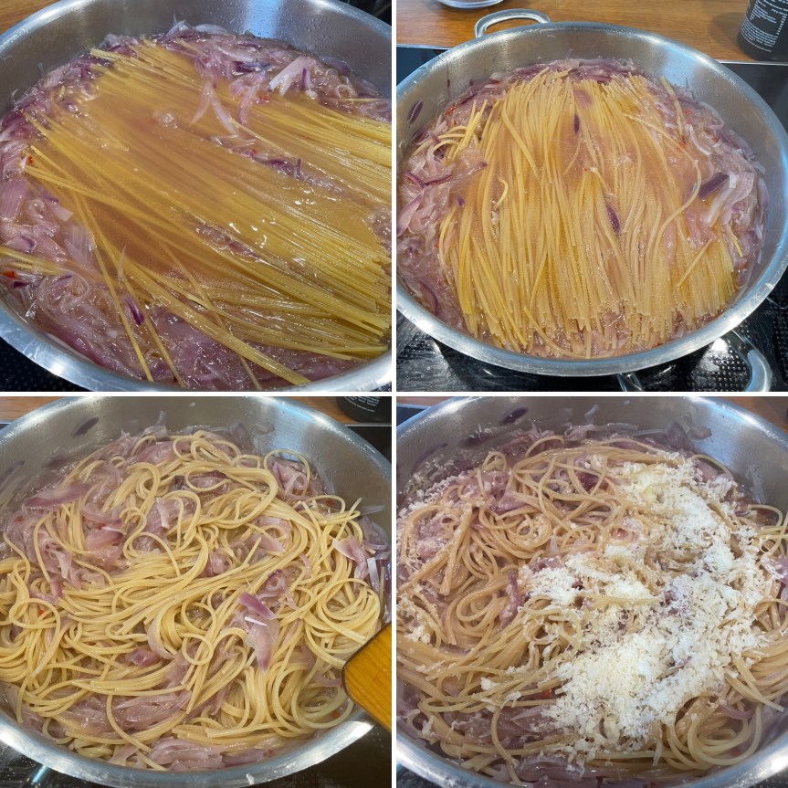 Jetzt lassen wir dann endlich die Spaghetti zu Wasser: Die Pasta kommt zu den Zwiebeln und sollte ab jetzt möglichst immer mit Wasser bedeckt garen. Es empfiehlt sich nach und nach bei Bedarf Wasser nachzugiessen. Wenn die Nudeln al dente gekocht sind und der Großteil der Flüssigkeit aufgesaugt wurde, heben wir den Käse unter und verrühren alles zu einer cremigen Soße. Dann nur noch mit Salz abschmecken.