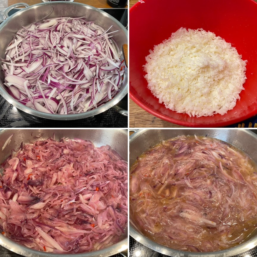 Wir benötigen natürlich vor allem Zwiebeln für dieses Gericht, also beginnen wir damit, ca. 1-1,2 kg geschälte Zwiebeln zu halbieren und dann in feine Streifen zu schneiden. Zusätzlich würfeln wir etwa einen Teelöffel Chilischote, welcher dann in reichlich Olivenöl angeschwitz wird. Wichtig ist, dass die Pfanne oder der Bräter / Topf ausreichend gross ist, um die Spaghetti in voller Länge aufzunehmen.