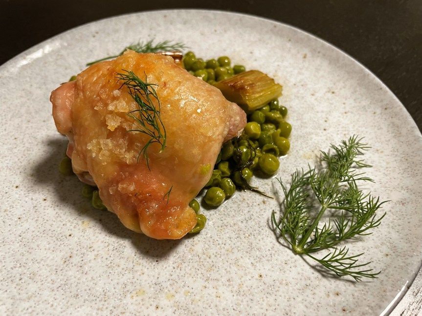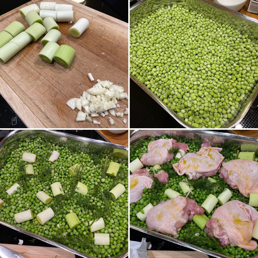 Als erstes putzen wir den Lauch und schneiden in in 3-4 cm lange Stücke. Den Knoblauch schälen und würfeln wir. Nun geben wir etwa 800 g TK-Erbsen auf eine sehr große Auflaufform oder alternativ auch ein Backblech, im Original wird eines dieser amerikanischen Backbleche benutzt. Dazu kommen etwa 50 ml Olivenöl, 60 ml Wermut, 1-2 TL Salz, der Geflügeljus sowie 3/4 des Dill. Alles gut vermischen, größere Stücke TK-Erbsen zerbrechen. Dann den Lauch darauf verteilen und das Huhn dazwischen setzen. Das Pollo fino sollte dafür am besten etwas zusammengerollt werden, aber so dass die Haut nach oben zeigt. Das Fleisch wird mit Olivenöl und etwas Salz beträufelt bevor alles für 45 min bei 200° Ober-/Unterhitze in den Ofen kommt.
