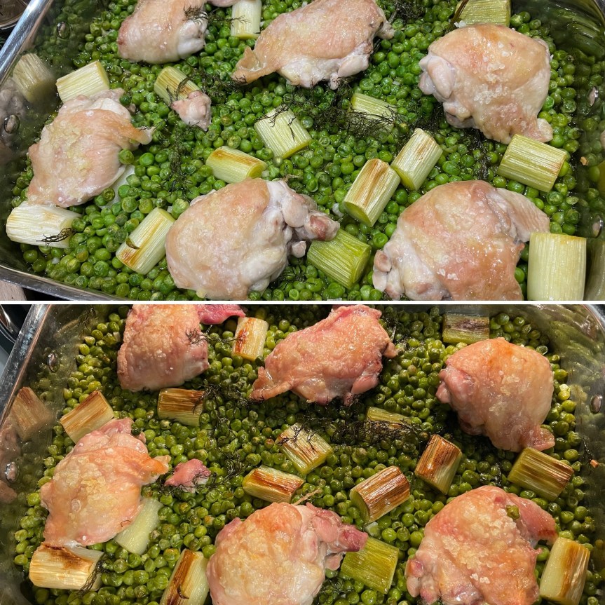 Nach dieser Zeit nehmen wir die Hühner auf den Erbsen einmal heraus und rühren die Erbsen unter, so dass diese möglichst unter der Flüssigkeit verschwinden und nicht zu dunkel werden. Der Lauch hingegen soll durchaus ein paar leckere Röstaromen bekommen und darf oben auf bleiben. Jetzt geht es für weitere 30 Minunten in den Ofen.