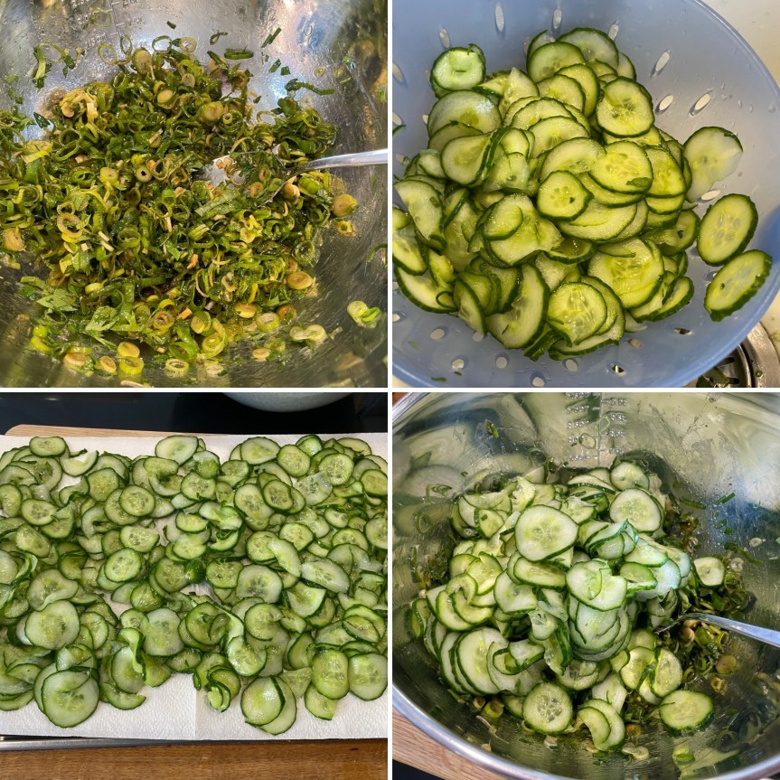 Die Gurken werden falls nötig geschält. Man kann nun entweder die Kerne entfernen und/oder die Gurken nach dem Schneiden (Scheiben, größere Stücke, …) ordentlich salzen und in einem Sieb 15 Minuten stehen lassen, so dass sie Wasser verlieren. In der Zwischenzeit schneiden wir die Frühlingszwiebeln in dünne Scheiben. Wir würfeln Knoblauch und Ingwer und vermischen dies mit den restlichen Zutaten zu einem Dressing.