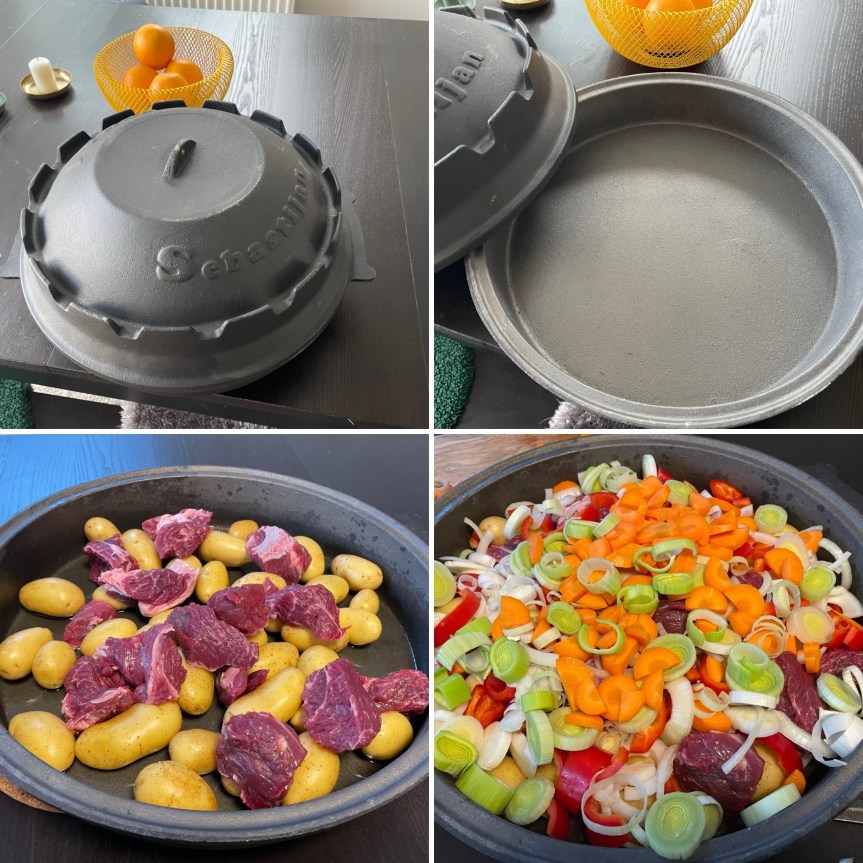 Die Peka, genauer gesagt die flache Pfanne, wird gründlich mit Olivenöl eingeölt. Dann empfiehlt sich eine erste Lage Gemüse, sehr gut eigenen sich Kartoffeln. Darauf folgen dann größere Fleischstücke und nach und nach das restliche geputzte und mundgerecht zerkleinerte Gemüse. Jede Lage wird mit 1-2 EL Vegeta gewürzt.