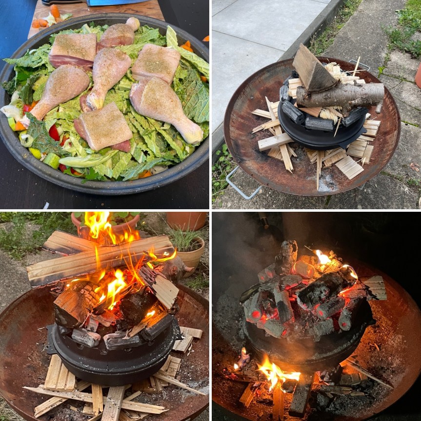 Gegen Ende Bauchfleisch und Geflügel auflegen, einige Zweige Majoran und Petersilie hinzugeben und Fond sowie etwas Wein angießen. Die Peka wird nun auf 3-4 glühende Kohlen gestellt und mit der doppelten bis dreifachen Menge Kohlen bedeckt. Alternativ funktioniert natürlich auch Holzglut, allerdings sollte man kein Feuer auf der Peka entfachen, das ist zuviel Oberhitze. Nach ca. 30 Minuten kann man Gemüse mit kurzer Garzeit hinzufügen. Nach ca. 1,5 h sollte das Essen dann fertig sein – ein wunderbarer Duft macht sich bemerkbar! Dazu passt Baguette – Guten Appetit!