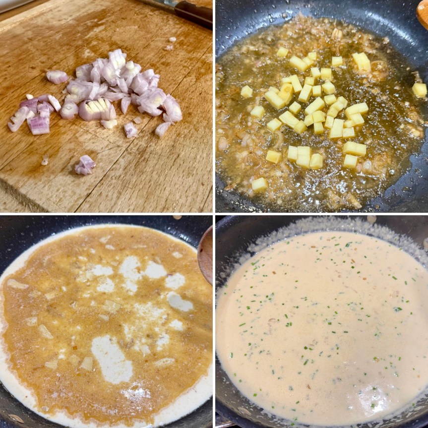 Während das Fleisch im Ofen ist, stellen wir unsere delikate Soße her. Dazu eine Schalotte fein würfeln und dann in Öl kurz anschwitzen, am besten in der gleichen Pfanne in der wir das Filet angebraten haben. Jetzt wird mit dem Weisswein abgelöscht. Wir geben einige Käsewürfel hinzu und auch den Geflügelfond. Wenn der Käse geschmolzen ist, kommt die Sahne hinein. Nun folgt der geriebene Parmesan, die Menge richtet sich nach Geschmack und Konsistenz der Soße. Abgerundet wird alles mit etwas Schnittlauch, worauf mit Salz, Pfeffer und etwas Zucker abgeschmeckt wird. Die fertige Soße stellen wir warm. Auch die Beilagen, hier Spätzle und grühne Bohnen, werden nun zubereitet.