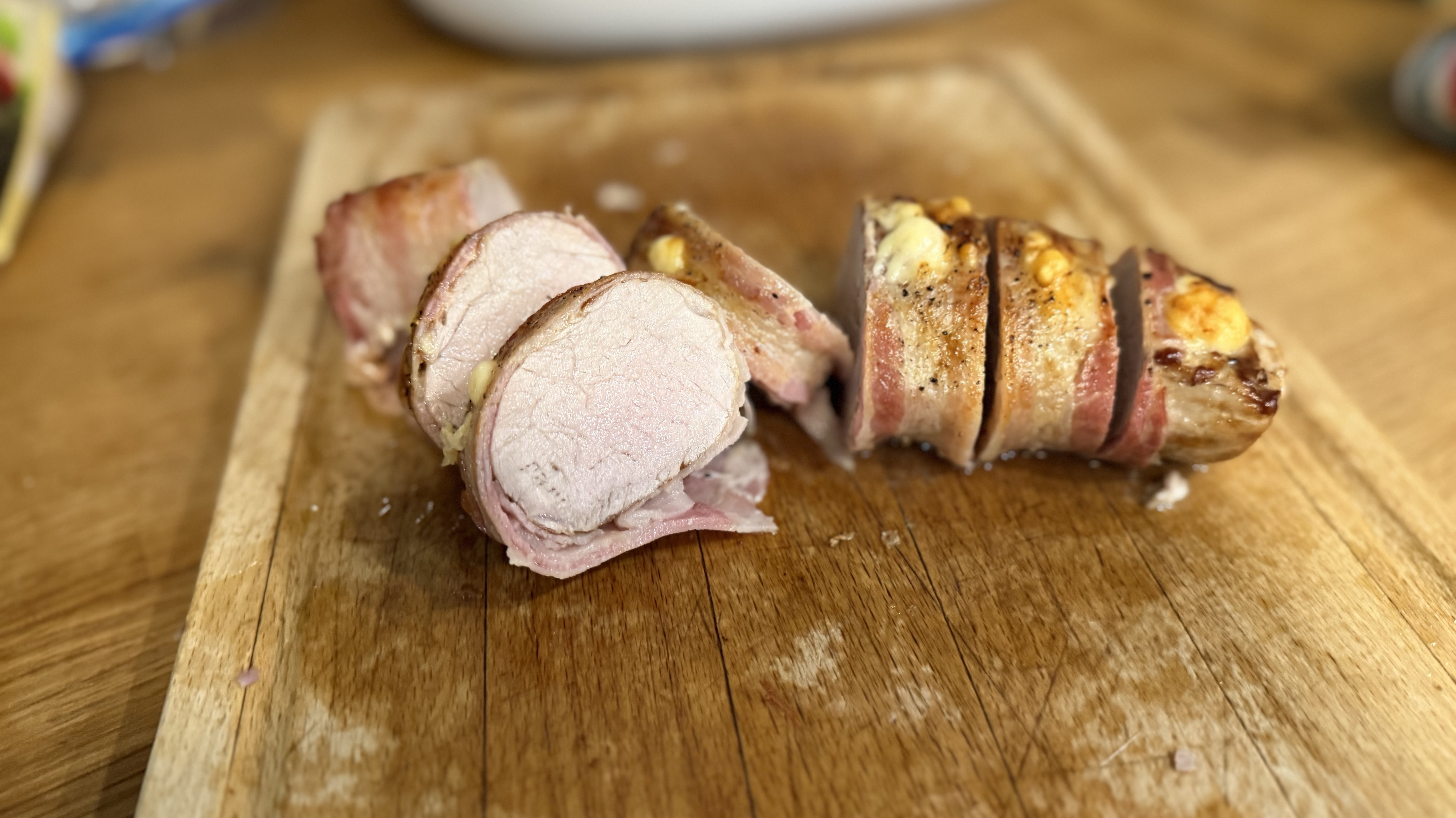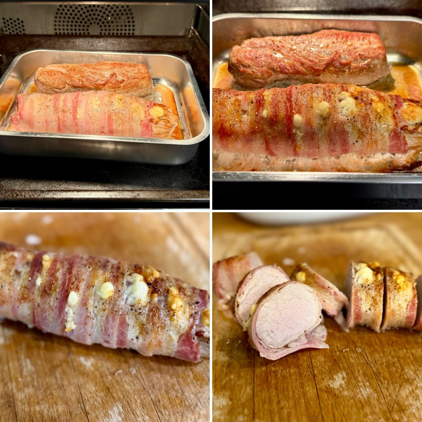 Das Fleisch kommt nun für 30 Minuten bei 150° C Umluft in den Backofen. Danach sollte man ggf. noch für 5 Minuten den Bacon unter dem Oberhitzegrill etwas mehr Farbe annehmen lassen, damit dieser schön knusprig ist. Das Fleisch sollte dann noch schön saftig und ganz leicht rosa sein.