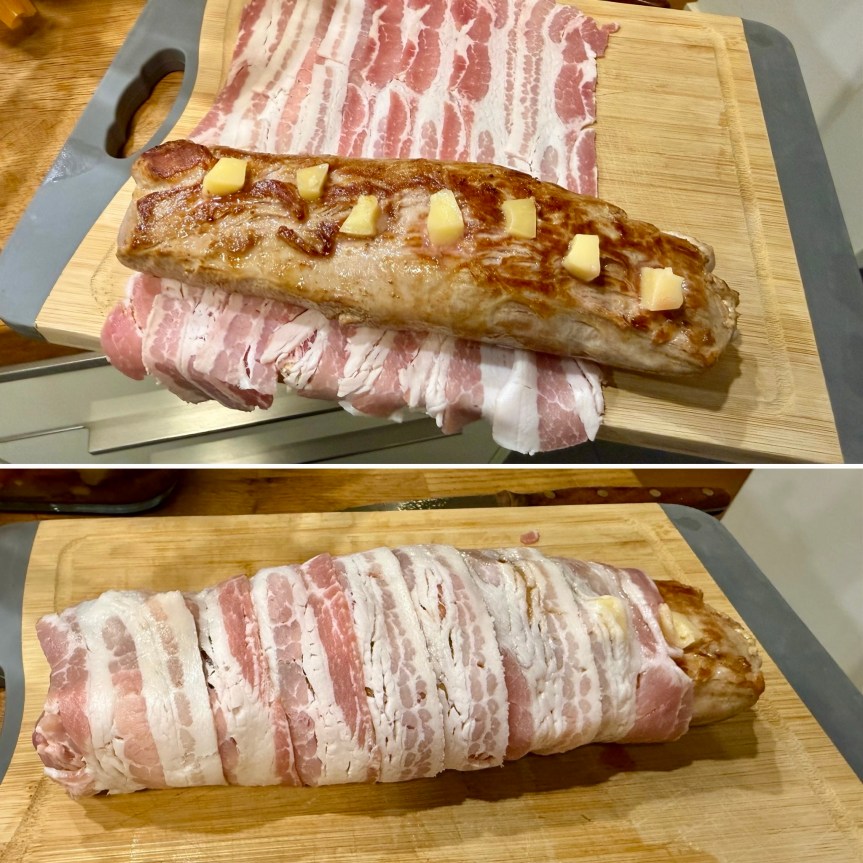 Nun legen wir die Baconstreifen auf einem Küchenbrett überlappend nebeneinander aus. Darauf kommt dann unser gespicktes Schweinefilet. Dieses rollen wir dann, wie oben zu sehen, eng in seinen Baconmantel ein.