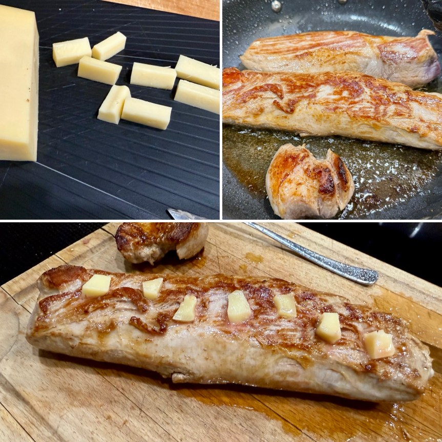 Zunächst schneiden wir aus dem Filet ein schönes gleichmäßiges Mittelstück und braten dieses rundum scharf an. Währenddessen stellen wir uns ein paar „Käsestifte“ aus Gouda her. Wenn das Fleisch etwas abgekühlt ist, stechen wir mit einem schmalen Messer Löcher hinein, in welche die Käsestücke gesteckt werden. Anschließend würzen wir das Filet mit Salz, Pfeffer und Paprikapulver.