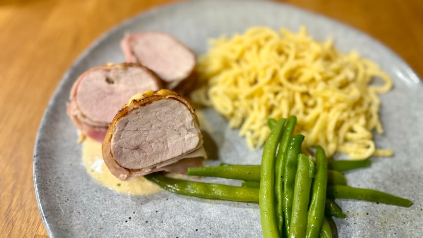 Um sich gegen die winterliche Kälte zu wappnen, braucht es eine großzügige Kalorienzufuhr. Genau dabei hilft dieses Rezept: Saftiges Schweinefilet, gespickt mit Käse und ummantelt mit knusprigem Bacon, dazu eine cremige Käsesoße … fast wie ein Käsefondue, aber mit Filet statt Brot 😀 Als Beilage passen Spätzle und grüne Bohne ausgezeichnet. Hört sich gut an? Dann auf in den Kampf gegen das Kaloriendefizit!
