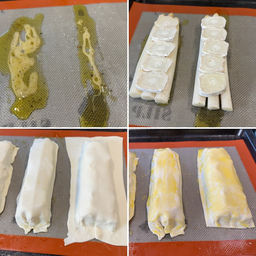 Die Spargelstangen werden geschält und ggf. etwas gekürzt. Auf Backpapier oder einer Silikonmatte träufeln wir etwas Olivenöl, würzen es mit Salz und Pfeffer und verteilen großzügig Honig darüber. Hierauf wird der Spargel gebettet und mit Scheiben des Ziegenkäses belegt. Diesen kann man ebenfals mit etwas Honig beträufeln. Dann alles mit Streifen des Blätterteigs bedecken und an den Rändern festdrücken. Zuviel Überstand abschneiden und mit Eigebl einpinseln.
