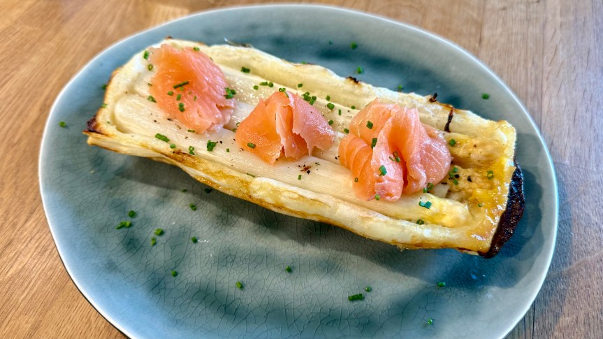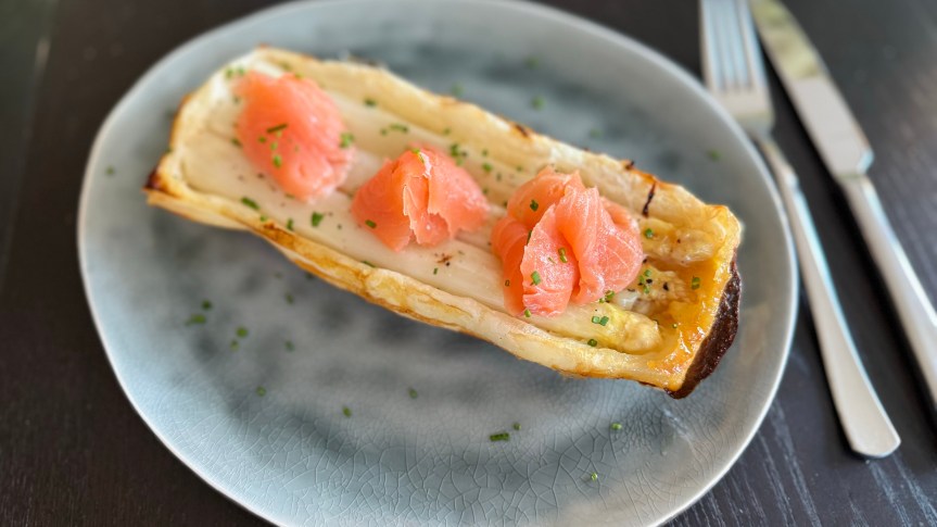 Die Spargel-Schiffchen werden bei 180° C für ca. 30 Minuten gebacken. Sollten sie zu dunkel werden kann man sie mit Alufolie abdecken. Währenddessen schneiden wir den Schnittlauch in feine Röllchen. Rausholen und vorsichtig umdrehen, dann mit einer Messerspitze prüfen, ob der Spargel gar ist. Nun nur noch mit Lachsscheiben und Schnittlauch anrichten – dazu passt ein knackiger Salat! Guten Appetit!